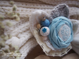 Розочку бледными голубыми ниточками вышила на флисе, для уюта. Мне этот материал очень нравиться, он приятный  на ощупь и смотрится очень мило. Вокруг навертела розу из льняной ткани с выработкой.