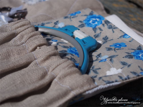 Справа я сделала 2 кармашка. Один для равномерки и ткани, другой для пялец с текущим процессом. Дорожные пяльца у меня самые простенькие, пластмассовые, зато в цвет)) С этими кармашками случился казус. Когда я уже все пристрочила, вывернула и проверяла, выяснилось что резинка сбежала и никак её обратно не вернуть. Пришлось распарывать приличную часть работы, все переделывать. Ох и сердилась я тогда!